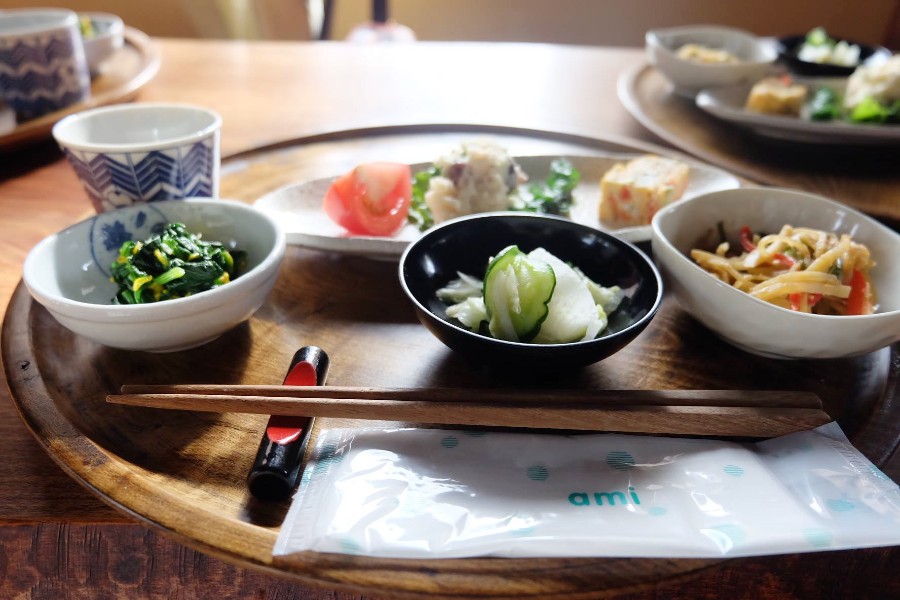 Chúng tôi di chuyển qua gian phòng bên, nơi có một chiếc bàn dài. Một người phụ nữ tóc hoa râm với chiếc tạp dề màu vàng đang thoăn thoắt dọn lên những mâm cơm, tách trà, chén đũa, … Và thật ngạc nhiên, tất cả mười món được mang ra đều là các món thuần chay. Cà rốt, bông cải hầm, … một chút khoai nghiền, một miếng đậu hũ, một miếng chả, rau củ chiên bột tempura, … không cầu kỳ, không khoa trương, nhưng lại có một hương vị tươi ngon không tưởng lại đến từ những món chay. Một điều ngạc nhiên nữa là các loại nguyên liệu trên bàn, ngay cả gạo đều được trồng ở sân sau nhà của người phụ nữ với chiếc tạp dề màu vàng ấy.