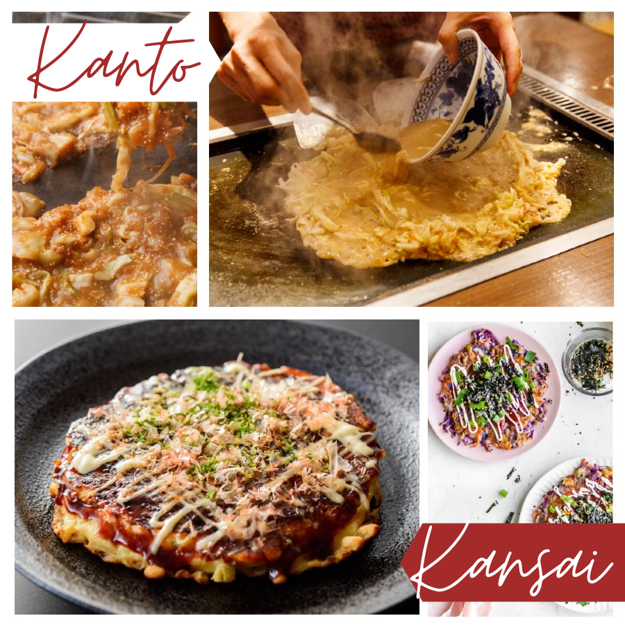 Món okonomiyaki Kansai được phủ một lớp nước sốt thịt nướng kiểu Nhật, sốt mayonnaise và vảy cá bonito; Monjayaki của Kanto dùng bột lỏng nên bánh sẽ trở nên nhão và rời rạc hơn so với Okonomiyaki. Cho dù bạn thích món bánh xèo Nhật được chế biến theo ẩm thực Kanto hay Kansai thì cả hai đều có thể thưởng thức cùng một ly bia đá lạnh.
