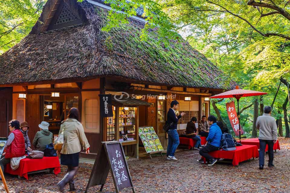 Bạn có thể vừa ngắm cảnh mùa thu, ngồi nhâm nhi một tách trà hay tương tác với những chú hươi hiền lành, tâm hồn nhẹ hẫn và an tựa bên những ngôi đền linh thiêng trong khuôn viên.