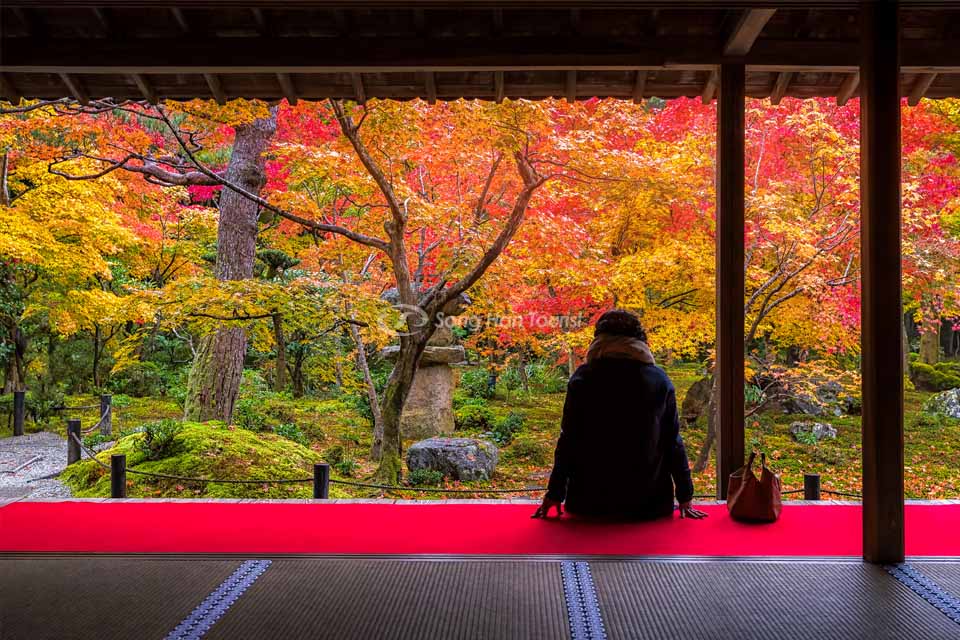 Ngồi bên trong chùa Shisendo và nhìn ra ngoài vườn Nhật ngắm cảnh mùa thu (Kyoto)
