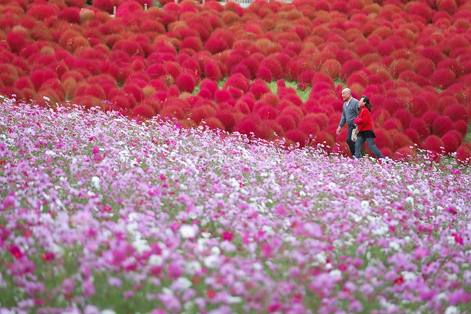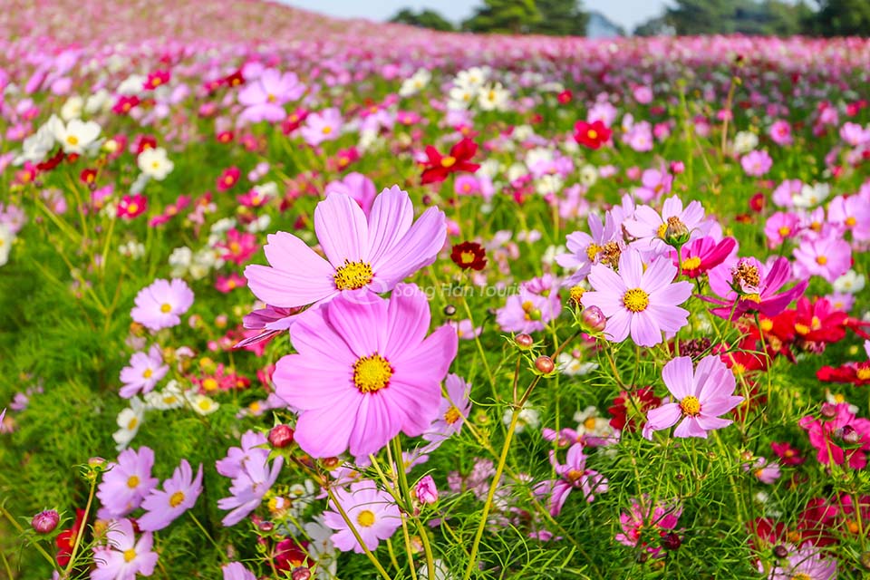 Hoa Cosmos là loài hoa mùa thu được yêu thích ở Nhật Bản. Có 2,000,000 cây hoa cosmos bung nở trong công viên Hitachi Seaside mỗi năm. Loài hoa này được trồng bên dưới ngọn đồi Miharashi và gần như nở cùng một lúc với sự chuyển màu của cỏ kochia. Một lần nữa, bạn khó có thể tìm thấy nơi nào ở Nhật Bản có cỏ thảm cỏ kochia và thảm hoa cosmos cùng khoe sắc một lúc bên cạnh nhau.