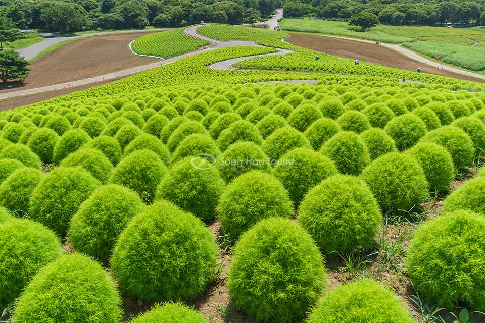 Mỗi tháng 8 sẽ có sự kiện chiếu sáng cỏ kochia. Công viên hy vọng những cây cỏ kochia màu xanh sinh động sẽ được trân trọng như khi mùa thu đến.