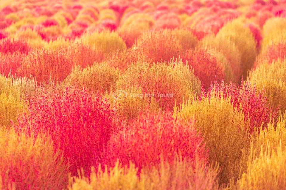 Cuối tháng 9, cỏ kochia sẽ chậm rãi chuyển sang màu đỏ, màu xanh ở gần rễ và màu đỏ trên chóp. Một sự chuyển màu mềm mại giữa hai mùa. Vào cuối tháng 10, cỏ kochia bắt đầu chuyển sang vàng. Đây cũng là dấu hiệu cắt bỏ những cây cỏ trước khi bước sang tháng 11.