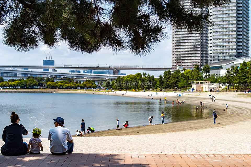 Bờ biển Odaiba là một bãi biển nhân tạo với chiều dài 800 m, nằm gần những trung tâm thương mại. Khách tham quan có thể bơi, tắm nắng, chơi bóng chuyền bãi biển hay ngắm hoàng hôn tuyệt đẹp hạ xuống chân trời.