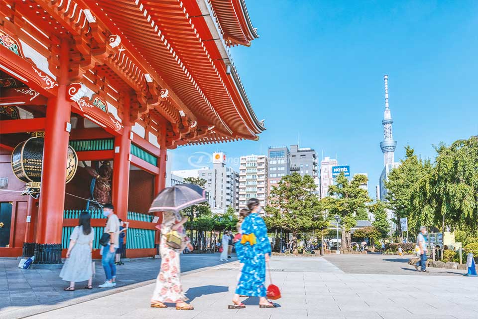 Đền Asakusa Kanon với hình ảnh tháp Tokyo Skytree đằng xa