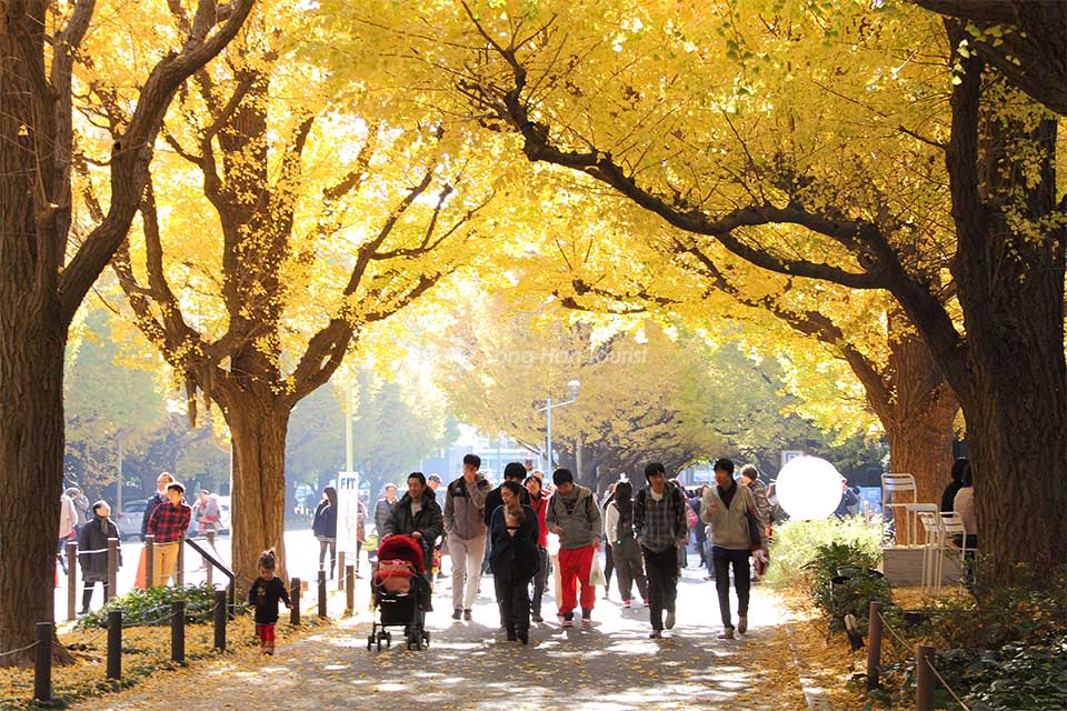 Con phố Gaien Mae dài 300m có đến 146 cây rẻ quạt được cắt tỉa gọn gàng. Thời điểm cây bắt đầu chuyển vàng là từ tháng 11 đến đầu tháng 12. Cảnh sắc tuyệt mĩ nơi đây thu hút rất nhiều du khách đến chụp hình hay tận hưởng không khí mùa thu. Đặc biệt hơn nữa khi lá vàng rụng trải thảm dưới mặt đất sẽ tạo thành một con đường lá vàng hút mắt, nền nã cho những bức ảnh tuyệt vời nhất.
