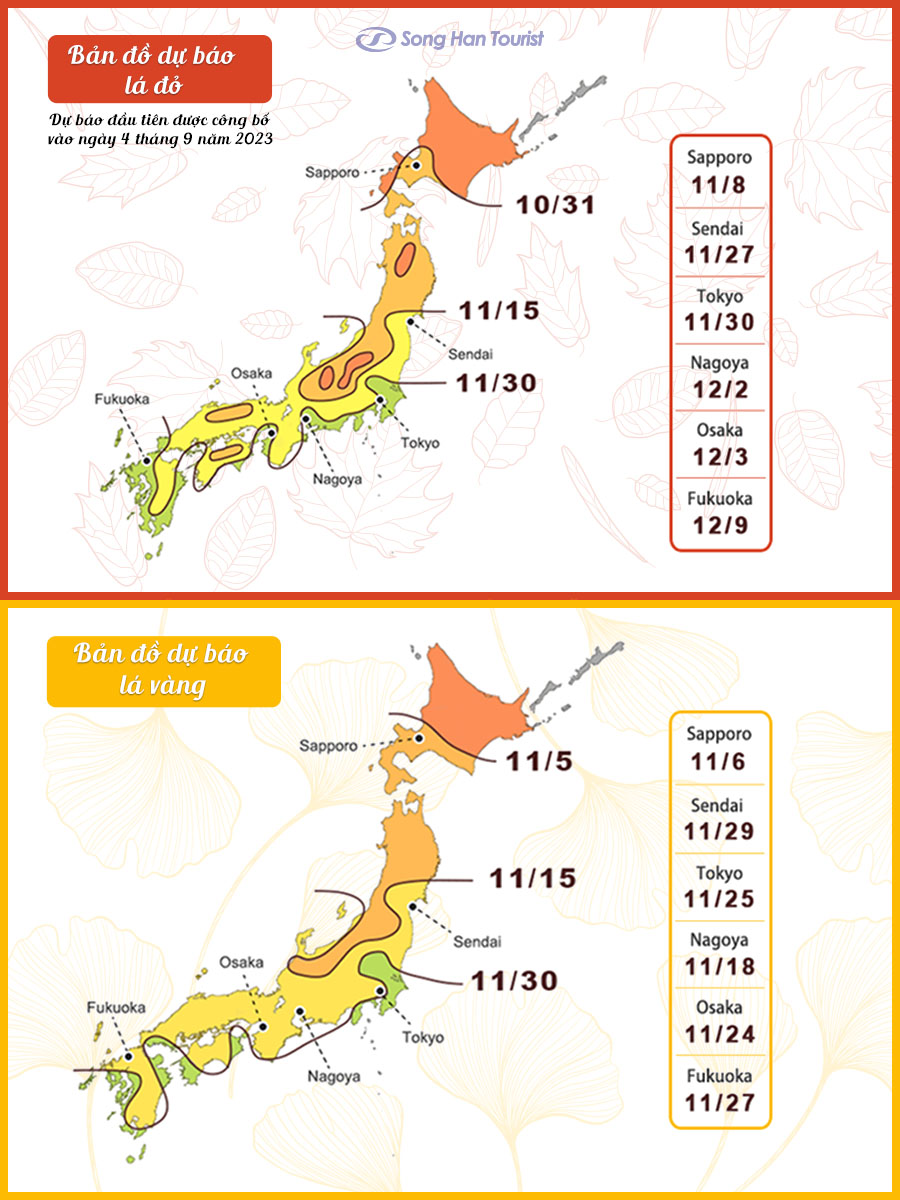 Tập đoàn Khí tượng Nhật Bản (JMC) đã đưa ra dự báo ngày ngắm lá đỏ (cây phong) và lá vàng (cây bạch quả) đẹp nhất ở khoảng 700 địa điểm trên khắp nước Nhật, trải dài từ Hokkaido đến Kagoshima.
