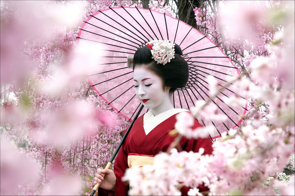 Nàng Geisha e ấp bên cánh hoa anh đào