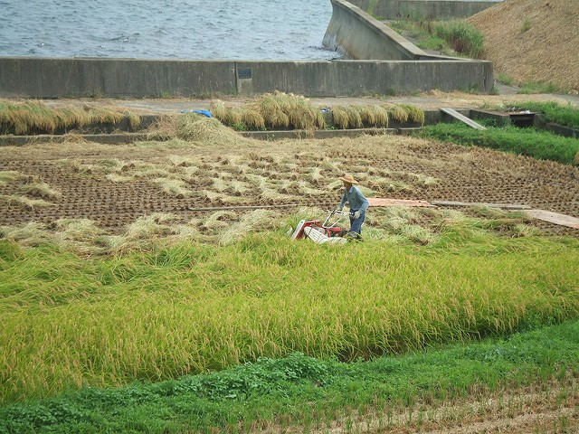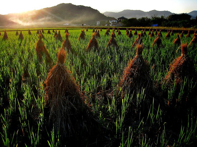 Mùa Hạ qua đi mùa Thu đầy nắng ấm đến là hồi chuông báo hiệu mùa thu hoạch. Những hạt thóc vàng mẩy dần trở nên cứng chắc dưới nắng thu. Nước trên cánh đồng cũng được tháo ra để đất trở nên khô lại thuận tiện cho việc thu hoạch. Người Nhật đâu đó vẫn còn áp dụng gặt tay cho lúa, những thân cây lúa được gặt bằng dụng cụ chuyên dụng như lưỡi hái của Việt Nam. Lúa gặt xong bó lại thành bó và “ đập” cho hạt rơi ra. Lúc này họ sẽ tỉ mẩn lựa những hạt thóc giống cho vụ mùa sang năm.